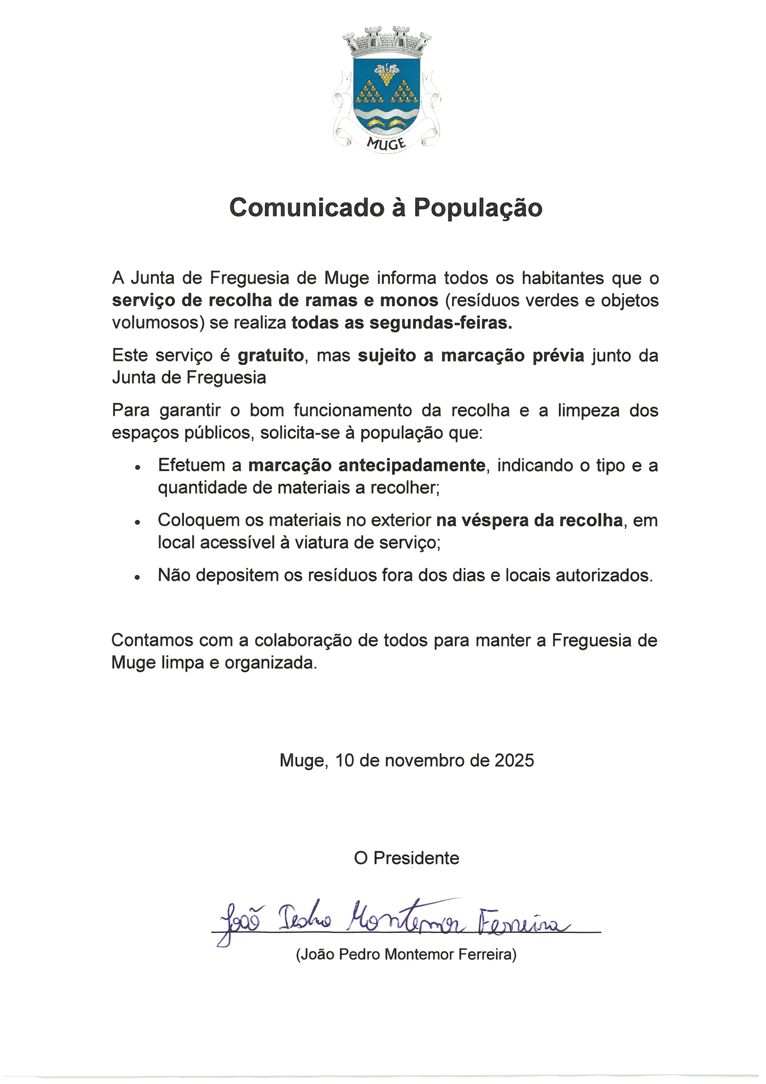 Comunicado à população sobre a recolha de ramas e monos na Freguesia de Muge.